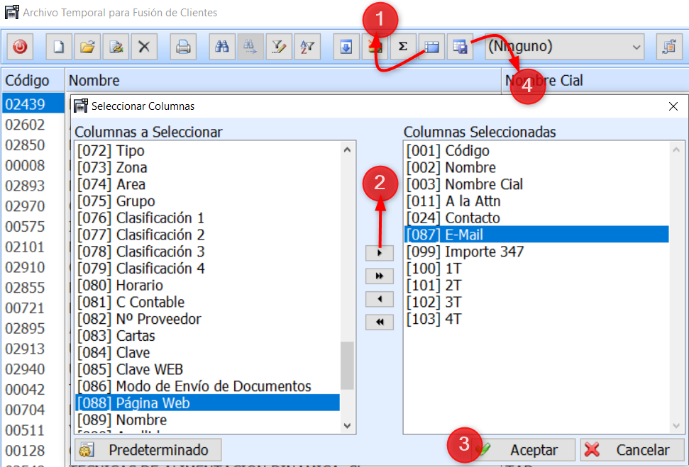 Seleccionamos las columnas a visualizar, no olvidándonos de las correspondientes al 347 y el email del cliente;