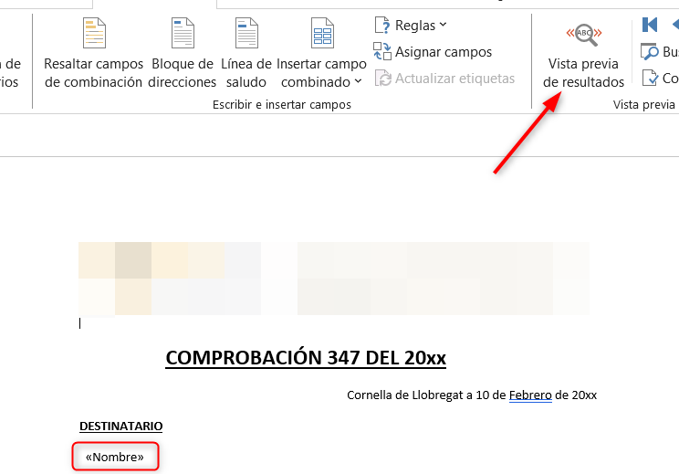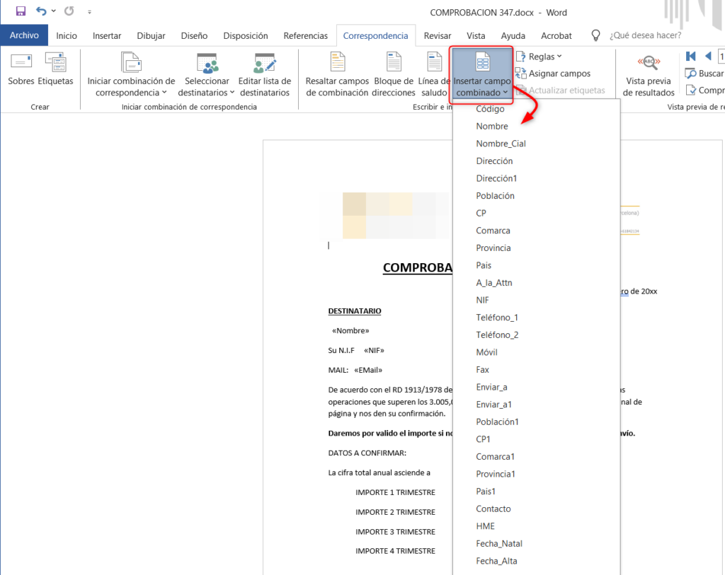 Una vez abierto el documento, deberemos darle a «Insertar campo combinado» y escogeremos los datos del cliente que queremos que aparezcan en dicho documento;