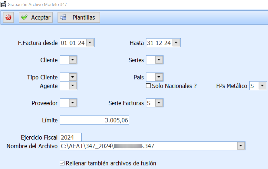 Debemos rellenar con los mismo datos que indicamos al sacar el listado anterior e indicar una ruta existente para guardar el archivo y dejamos marcado el dato «Rellanar tambien archivos de fisión»