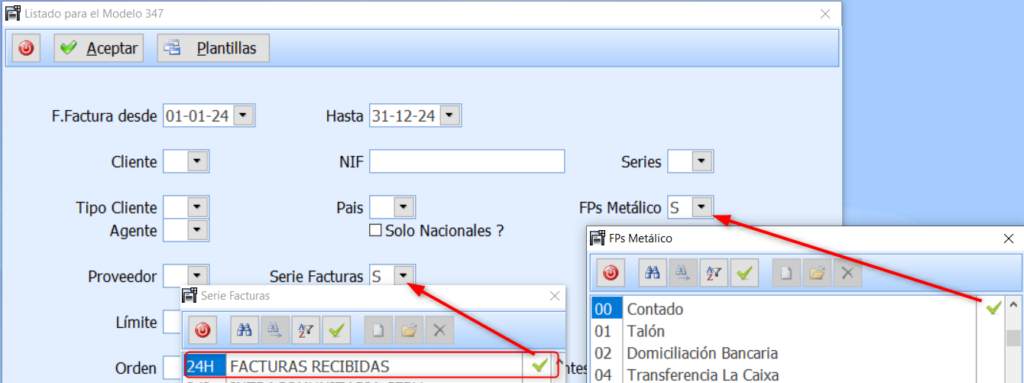 3. Indicaremos las fechas del año a lista y marcaremos la serie de Facturas de Proveedor y la FP Metálico, que tengamos creada (ejemplo del año 2024);
