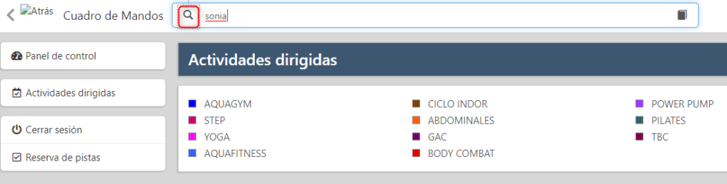 Desde el menú se deberá acceder al apartado Actividades Dirigidas a través del botón que muestra la imagen