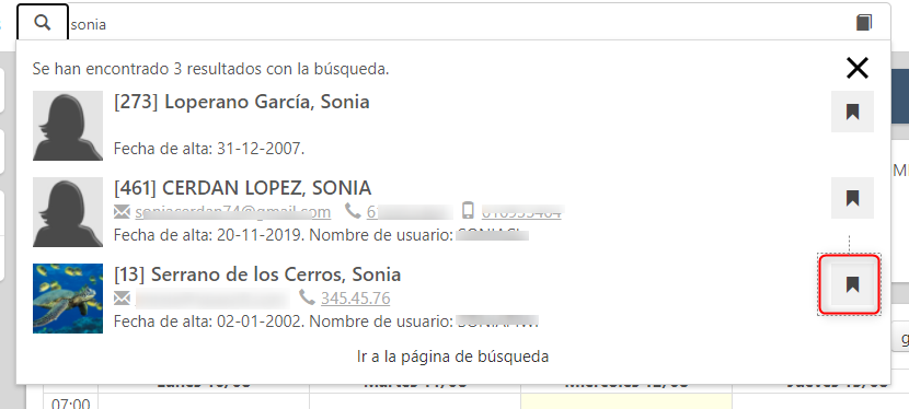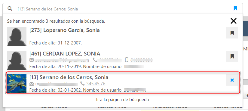 Para seleccionar el socio con el que se va a realizar la reserva se debe utilizar el  buscador , se puede introducir el código de socio, el nombre, apellidos y utilizando la «lupa»  el buscador nos mostrará las coincidencias
