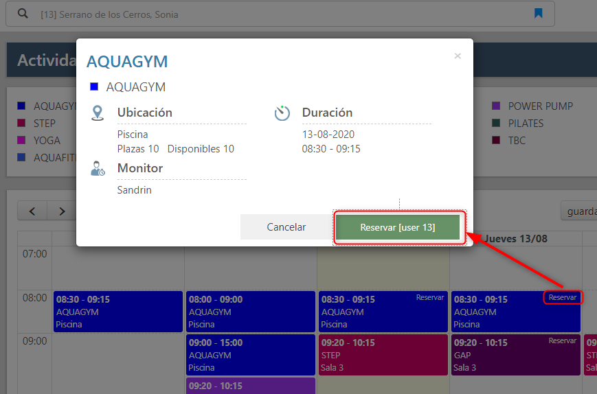 El siguiente paso es seleccionar la actividad en la que se debe realizar la reserva