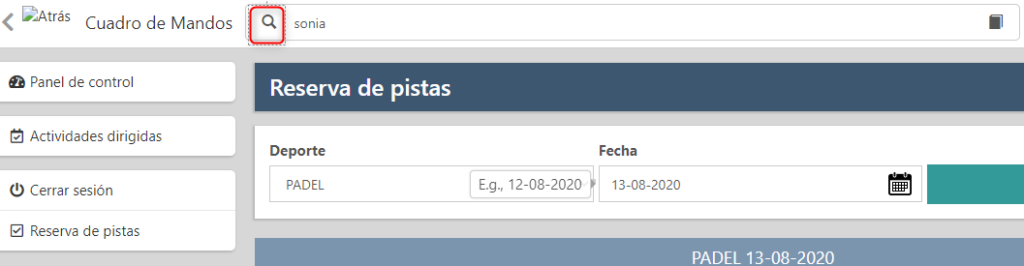 Para seleccionar el socio con el que se va a realizar la reserva se debe utilizar el buscador, se puede introducir el código de socio, el nombre, apellidos y utilizando la «lupa” el buscador nos mostrará las coincidencias