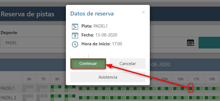 El siguiente paso es clicar sobre la hora de inicio de la reserva a realizar,