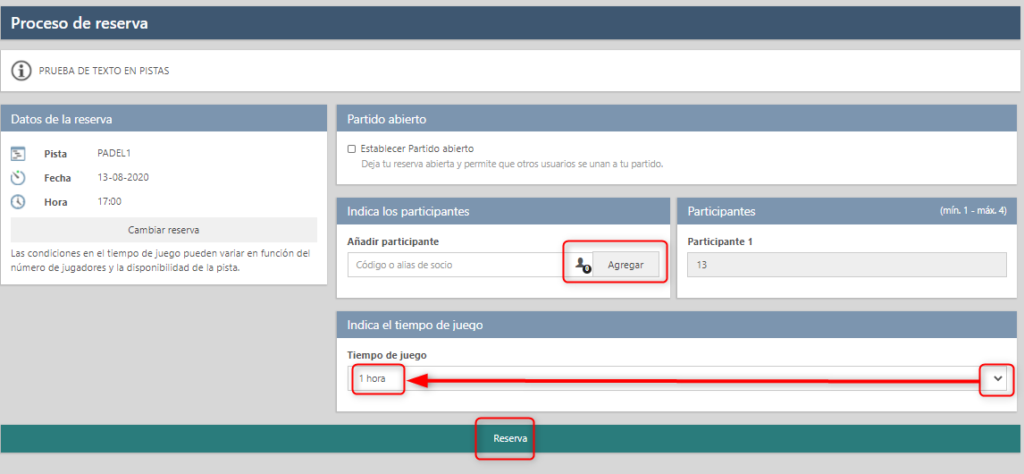 Seleccionando «Continuar», se mostrará la pantalla para que, si las condiciones de la reserva lo permiten, se puedan añadir participantes, y modificar tiempo de la reserva