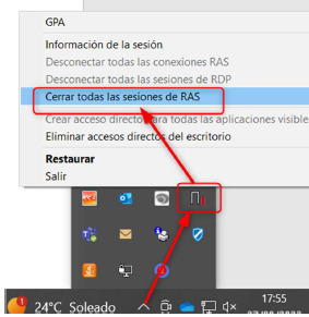 En la barra de tareas del ordenador, desplegar la fecha para buscar la aplicación de Parallels. Haremos botón derecho encima del icono y cerraremos todas las Sesiones;