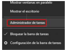 Esperaremos dos minutos y comprobaremos que el cierre ha sido satisfactorio haciendo botón derecho en la barra de tareas y accediendo a Administrador de Tareas;
