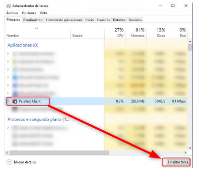 No debe aparece la aplicación de Paralllels en la lista, si aun aparece haremos el cierre ahí tambien;