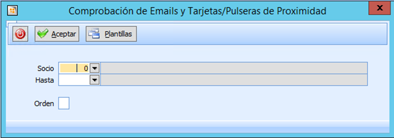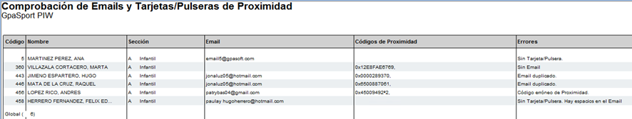 eGym > Listados > Comprobación de Emails y Tarjetas/Pulseras de proximidad