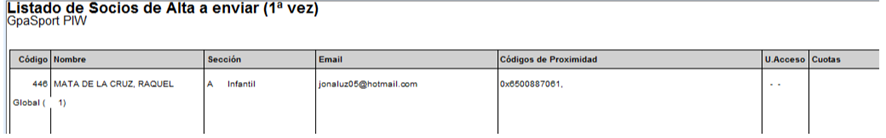 eGym > Listados > Listado Socios de Alta a enviar (1ªvez)