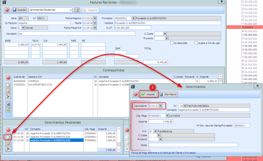 Si en la ficha del Proveedor /Acreedor, esta parametrizado correctamente, en el momento del registro de Factura nos propondrá un vencimiento con importe total de la factura, sino lo propone, se puede dar de alta utilizando el botón de la “hoja en blanco” o bien F2.