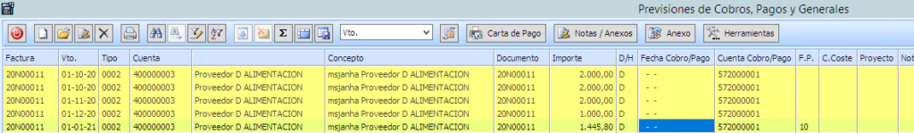Como muestra en la imagen, en “Previsiones de Cobros, Pagos y Generales”, aparecen los 5 vencimientos.