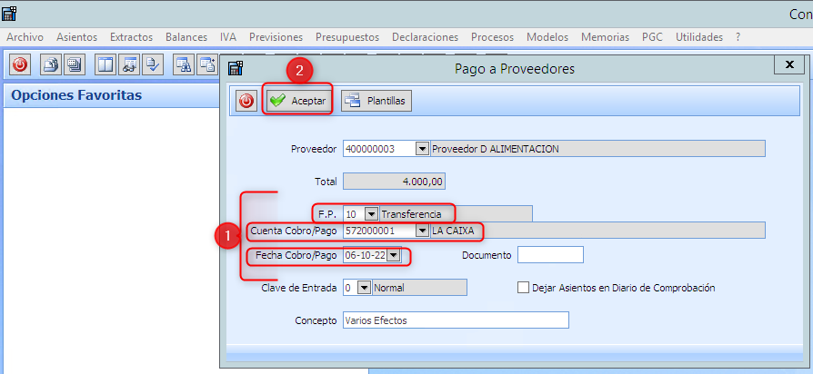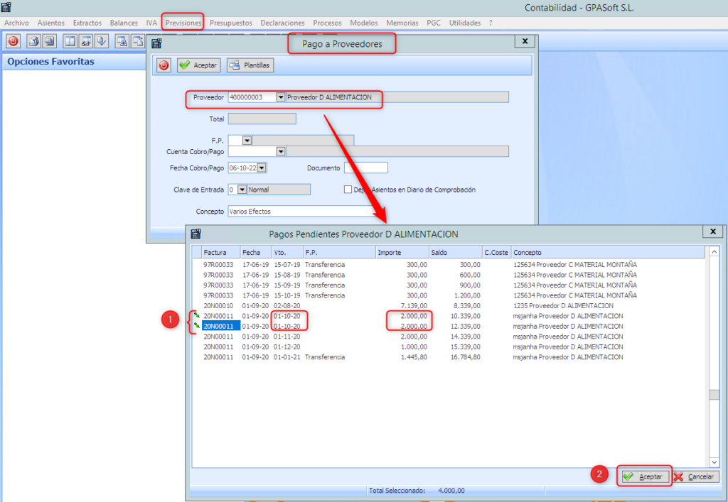 Seleccionamos el proveedor “Intro” muestra listado con los vencimientos pendientes del proveedor, marcar los que se han de pagar.