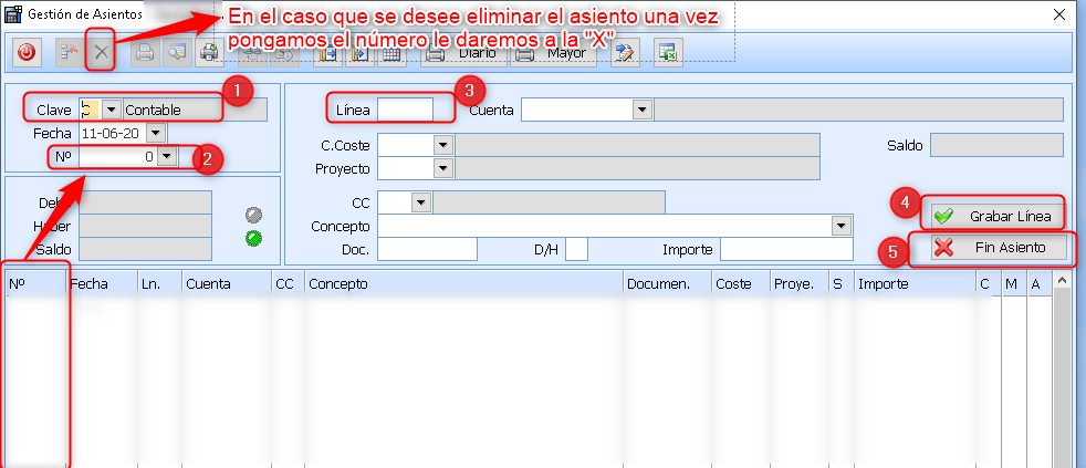 _Si queremos elimina un asiento completo, indicamos número de asiento, nos posicionamos en la primera línea y “X”, se eliminará por completo.
