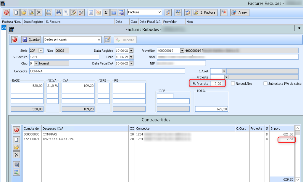 Si se ha registrado facturas y el cambio se realiza después, el programa no cambiará automáticamente la prorrata.
