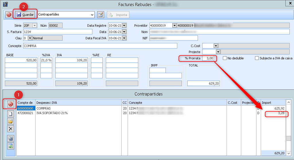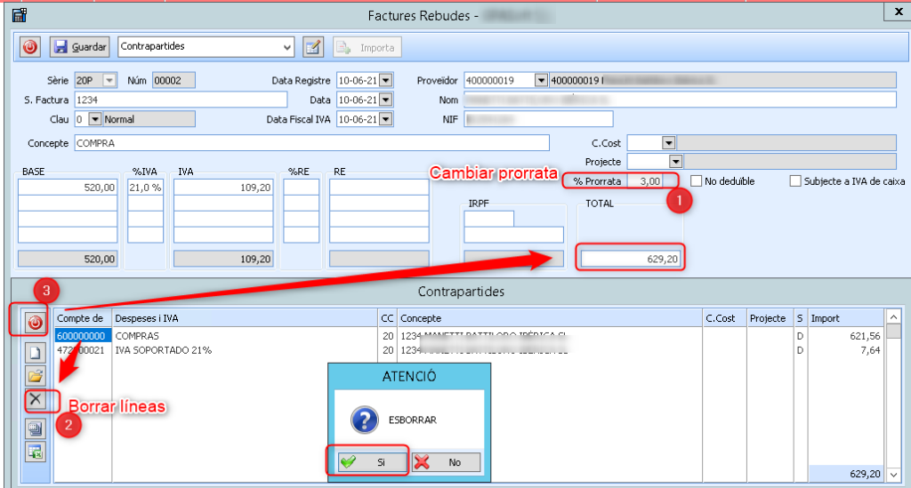 Cambiar prorrata de la cabecera “1”, borrar líneas de la contrapartida “2”