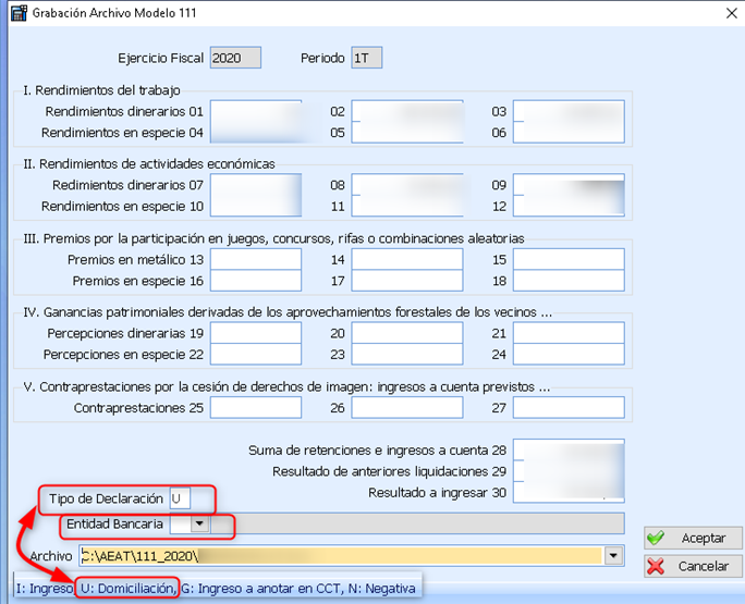 Al crea el Fichero se puedes marcar el tipo de declaración y nuestra cuenta bancaria.