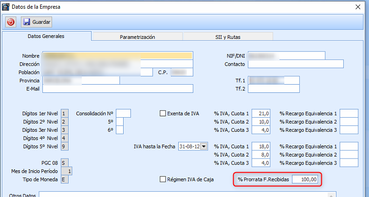 Configurar empresa “Archivo – Datos empresa”, Indicar 100% Prorrata