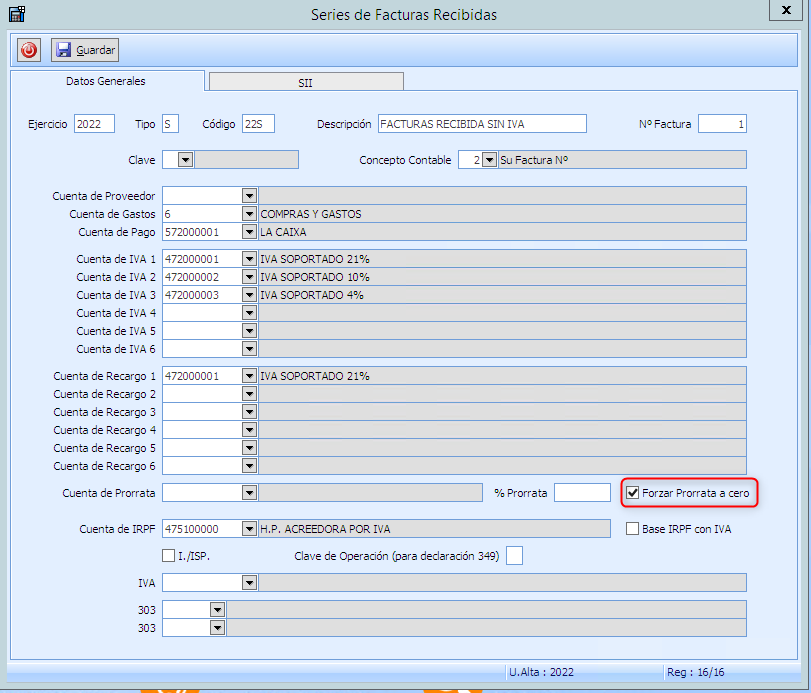 1_ Serie de factura que no tiene que presentar IVA, marcar forzar prorrata.