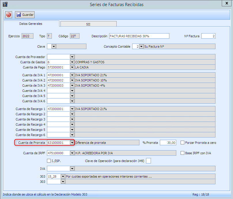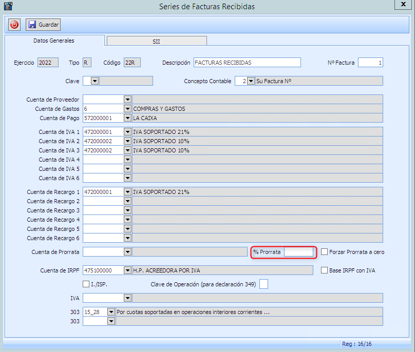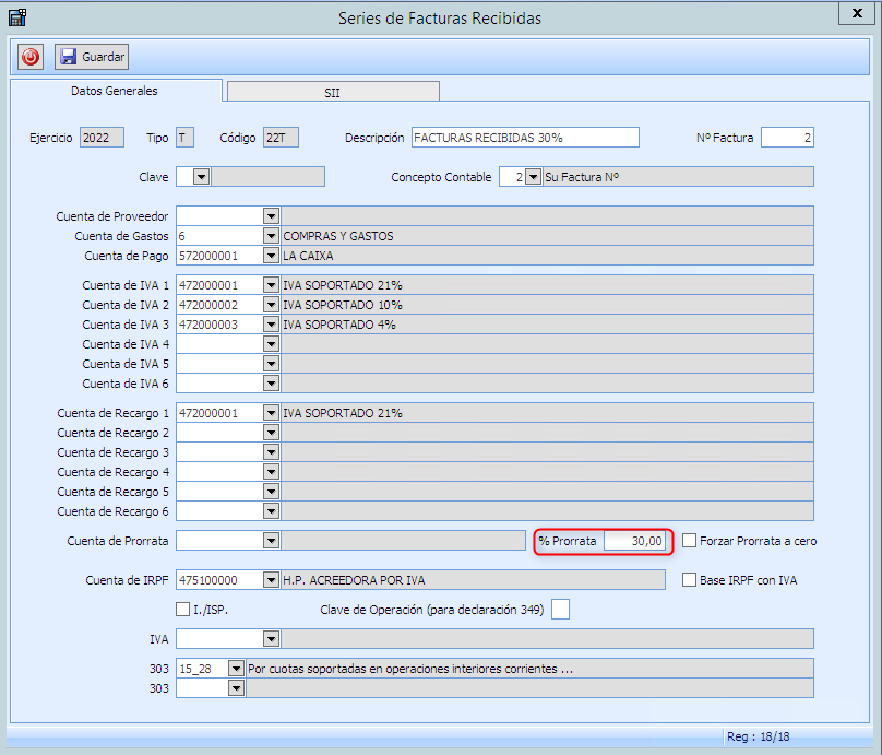3_ Serie de factura que tiene prorrata, en el campo % Prorrata se indicara el XX%.