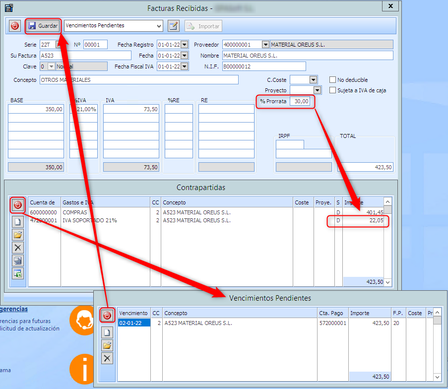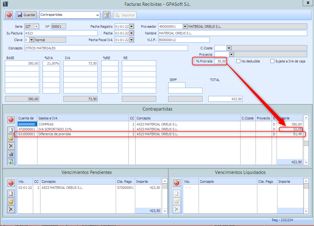 Al registrar factura tendremos la línea del gtos y en la línea del IVA con el 30% de prorrata