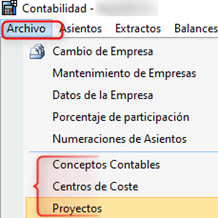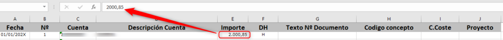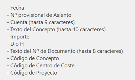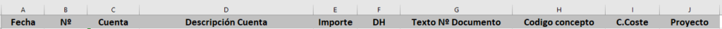 Las columnas, Código de Concepto, Código de Centro de Coste, Código de Proyecto, hace referencia a los datos de alta en las tablas, se debe poner el nº de código, no la descripción.