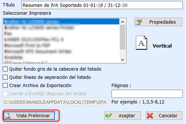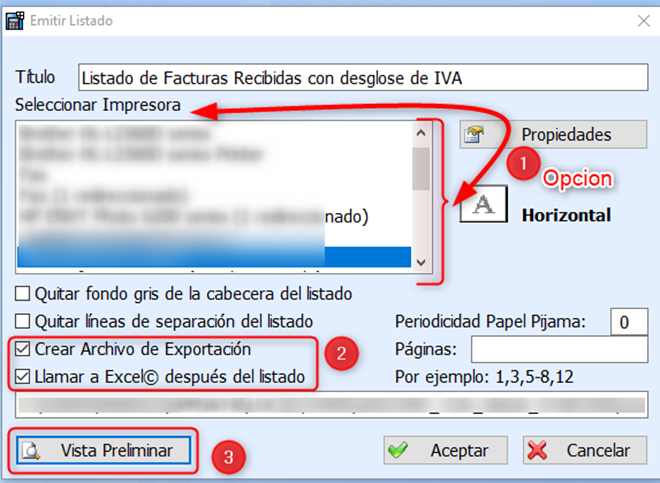 Muestra pantalla donde seleccionar Impresora y marcar para exportar a Excel