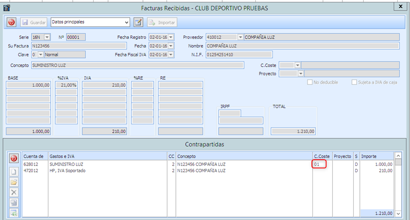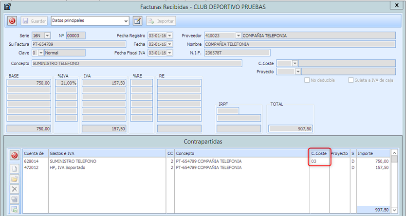 Si se indica un C. Coste concreto, por defecto en el registro de Factura lo muestra, siempre se podrá modificar.