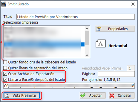 Se puede seleccionar Imprimir y exportar a Excel (después de Visualizar el listado, al salir creará el Excel).