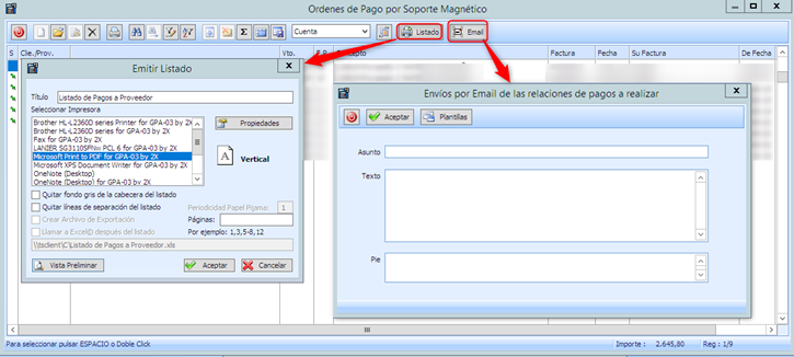 Desde esta pantalla permite imprimir listado y enviar email a proveed/acreed, con archivo adjunto de relación pagos.