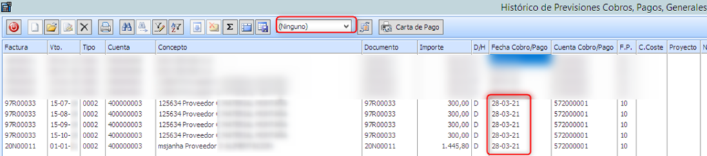 Comprobar primero en Previsiones – Histórico de Previsiones Cobros, Pagos Generales.