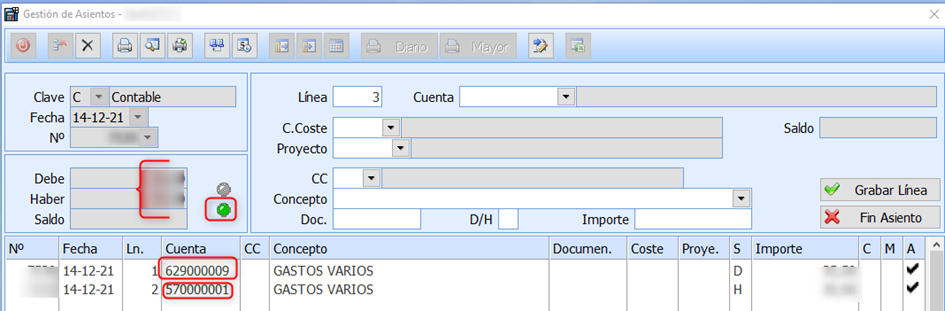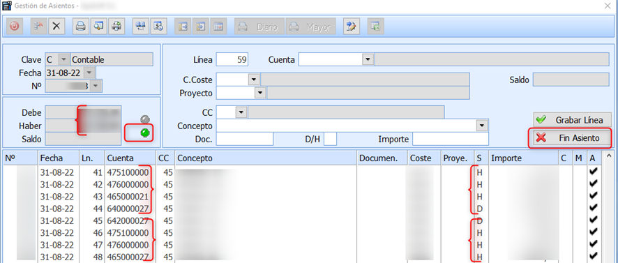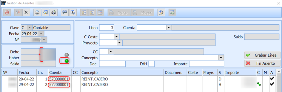La clave se propone por defecto, fecha registro, completar las líneas que compondrán el asiento, indicando en cada una “D” o “H” y “Grabar Línea”, una vez finalizado, si el asiento está cuadrado (círculo verde) se podrá guardar “Fin Asiento”