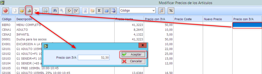 En el caso de que el incremento sea individual os deberéis situar sobre la columna que muestra la imagen de «Precio con IVA» y utilizando el botón que muestra la imagen o bien F12, el programa mostrará la pantalla donde deberéis indicar el nuevo precio.